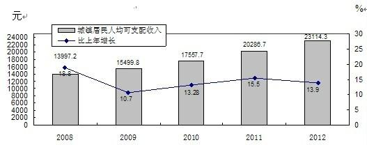 圖8 2008-2012年全市城鎮居民人均可支配收入及增速