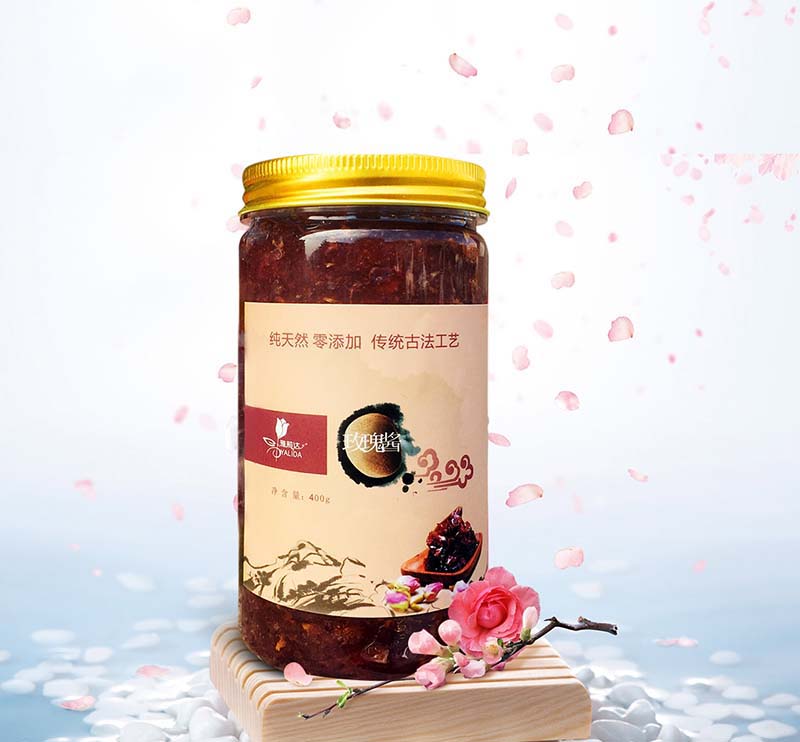 玫瑰花醬,是一種常見醬料,是將玫瑰花的花瓣用糖腌制成的。富營養、潤肌膚、養容顏、抗衰老。常期使用保持皮膚水份,香體。玫瑰花醬屬溫性食品,有疏肝醒脾之功能。頗受人們喜愛,是很早就廣泛應用于各種糕點、餡和菜肴中的主要原料。